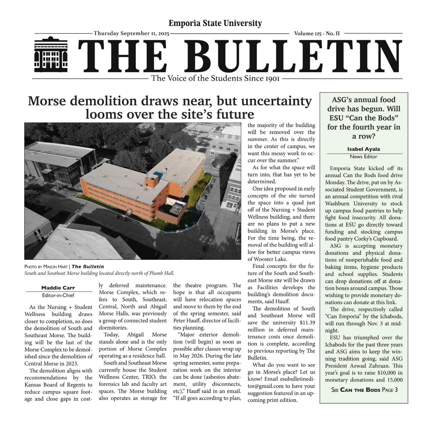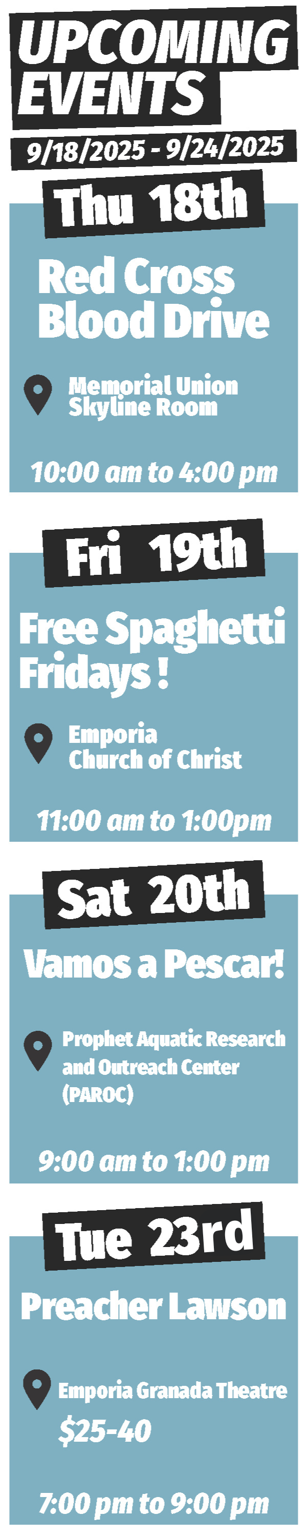 ![]() | POLICE LOGSLogs from ESU Police & Safety Sept. 17 Officer located suspicious activity in the 200 block of E 12th Ave. Officer responded to fire alarm at 1501 Market St. Sept. 15 Officer responded to South Towers for an elevator 911 activation. No contact with anyone. Sept 14. Officer responded to Schallenkamp Hall for a elevator 911 activation. It was accidental, HBO. Sept. 12 Officer contacted Emporia Animal Control regarding the cat hiding in students’ vehicles under hoods near Schallenkamp. Officer contacted by Emporia Animal Control Officer. Cat was caught. Officer dispatched to Abigail Morse Hall parking lot for report of subjects smoking marijuana in parked vehicle. Officer located vehicle, smelled the odor, and searched vehicle. Citation issued. Report taken. Case closed. Sept. 11 Officer dispatched to Memorial Union parking lot for a cat stuck under vehicle hood. Officer requested back at Memorial Union parking lot as cat had moved vehicles and was again up under a vehicle hood. Officer dispatched to Schallenkamp Hall parking lot for a cat stuck under another vehicle hood. |